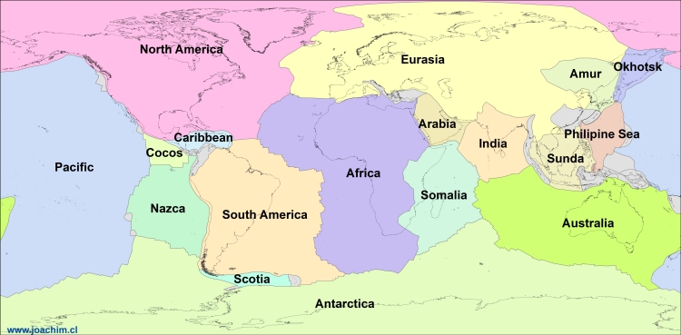 Es importante tener presente que no se debe confundir el concepto de las placas tectónicas con el concepto de corteza oceánica y continental. El siguente mapa demuestra en difernets colores las placas tecónicas, y además los límites de los continentes. (detalles: capítulo "borde continental pasivo")