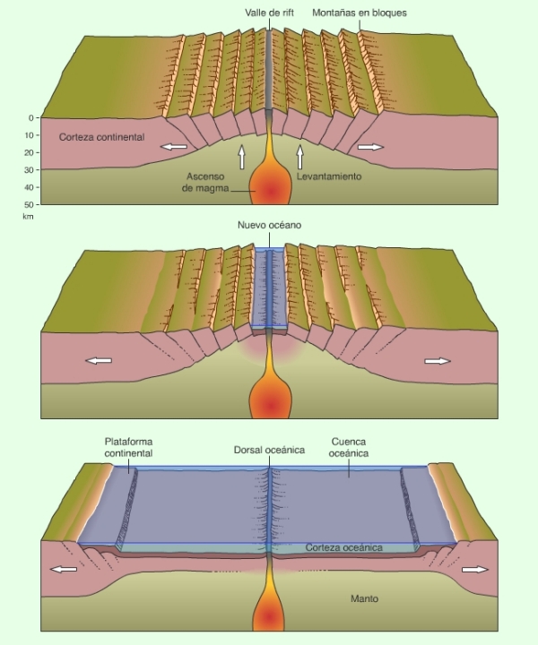 Tectónica de Placas En los lugares donde dos células de convección producen un movimiento ascendente, se produce una ruptura de la litósfera. Si esta ruptura se produce inicialmente dentro de una placa formada por corteza continental, se habla de una ruptura tipo "rift" (también conocido como "rift continental"). A la medida que el movimiento de elongación continúa, una parte de las rocas ascendentes del manto se funden, dando origen a un volcanismo inicial dentro de la zona de rift. Con el tiempo, las dos partes del continente se separan totalmente. Desde entonces, se identifica dos placas tectónicas separadas. La zona de rift se transforma en el límite entre ambas placas. A lo largo del límite, por la fusión parcial de las rocas del manto, se forman rocas magmáticas de composición basáltica, dando origen a nueva corteza oceánica. En vez de una zona de rift, el límite se denomina a partir de este momento "dorsal centro-oceánico". Los volcanes activos de las dorsales centro-oceánicas indican este tipo de límite. (La isla de Islandia forma parte de la dorsal centro-atlántico. En este lugar, el volcán submarino llega hasta la superficie formando la isla. Muchas otras islas a lo largo del mundo deben su existencia a las mismas circunstancias, como por ejemplo las islas de Ascensión y Santa Elena en el sur del océano atlántico.)