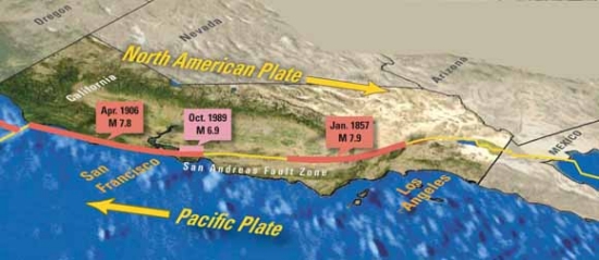 En otros lugares se puede observar este tipo de límite en la superficie de la tierra donde las placas se mueven en sentido opuesto a lo largo de una línea de contacto. El ejemplo más conocido de este límite es la "Falla San Andrés" (California, EE.UU.), donde la Placa Pacífica se mueve hacía el noroeste y la Placa Norteamericana hacía el sureste. A lo largo de este límite no se genera y tampoco se destruye corteza. Sin embargo, este tipo de límite está caracterizado por la presencia de una alta actividad sísmica, lo que transforma la zona de Califormia en uno de los lugares del mundo más expuestos a este tipo de peligro.