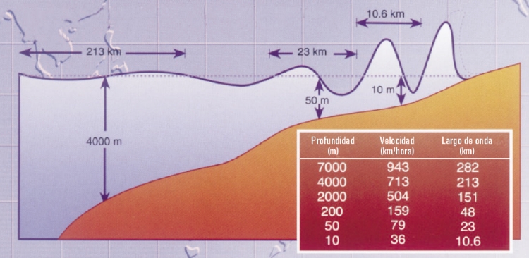 que se confunde con olas comunes). Cuando se acerca a la costa, la velocidad
