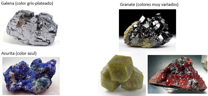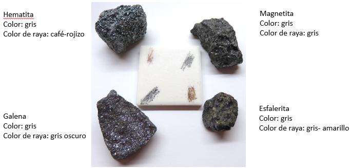 C3) Color Algunos minerales siempre se presentan con el mismo color, otros pueden tener colores muy variados. En algunos casos, el color es tan característico que el mineral se identifica básicamente por su color, en otros casos el color que presenta una muestra no es una gran ayuda para identificarla. A veces el grado de deterioro (por meteorización) del mineral altera el color, lo que dificulta la identificación. Minerales idiocromáticos: Algunos minerales siempre demuestran un color característico, es decir, no se contaminan con otros elementos químicos cromóforos. Minerales alocromáticos: Otros minerales pueden presentarse en colores a veces muy diferentes porque se contaminan fácilmente con otros elementos químicos. Ejemplos: C4) Color de raya Al moler un mineral o al rayar una placa de loza con una punta del mineral, muchos minerales (especialmente minerales de mena) dejan una huella de un color característico y muchas veces muy diferente al color del mineral. Los colores de raya pueden ser: blanco / sin color; gris y negro; verde; rojo y naranja; amarillo y café; azul, todos estos colores con diferentes tonalidades entre pálido y fuerte. Como regla general se puede decir que los minerales de color y brillo metálico presentan un color de raya igual o más oscuro que el color que presenta el mineral, mientras los minerales de color y brillo no-metálico presentan un color de raya menos intenso que el color que presenta el mineral. Ejemplos: C5) Luminiscencia Como luminiscencia se entiende cualquier emisión de luz que no sea por el resultado directo de incandescencia. Ejemplos: