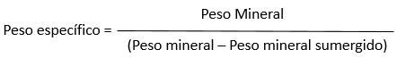 A2 ) Peso específico Algunos minerales son notablemente más pesados que otros. En terreno sirve esta información para diferenciar por ejemplo la baritina de calcita o yeso. Para determinar el peso específico de un mineral en laboratorio, se usa el siguiente método, basado en el hecho que todo cuerpo sumergido total o parcialmente en un fluido, experimenta una fuerza ascensional igual al peso del volumen de fluido desplazado (principio de Arquimedes): mediante una balanza simple (no de alta precisión), se determina dos veces el peso de la muestra de un mineral: - una vez pesando la muestra al aire - una segunda vez pesando la misma muestra sumergido bajo agua Sumergido en agua se obtendrá un peso inferior al del objeto pesado en el aire. La diferencia entre los dos pesos es equivalente a la fuerza ascensional del fluido. El peso específico expresado en [g/cm3] se determina mediante un cálculo simple: