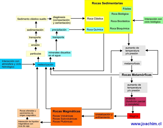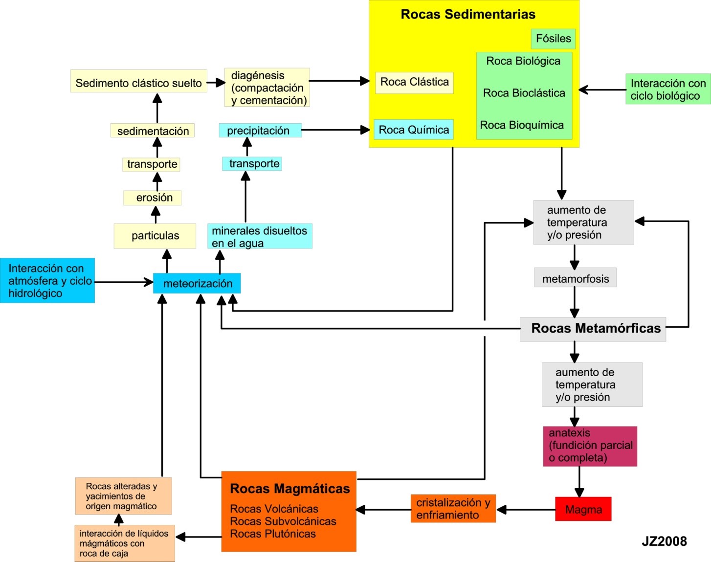 Petrografìa - ciclo geológico El ciclo geológico (o ciclo de las rocas) describe los procesos que forman, destruyen y transforman los diferentes tipos de roca, tal como demuestra la ilustración: A modo de ejemplo, durante la historia de una roca puede ocurrir lo siguiente: 1) En alguna parte y por algún motivo, dentro de la corteza terrestre se forma una intrusión de magma. 2) Por enfriamiento lento de este magma se forma la roca plutónica granito. 3) Durante millones de años, las rocas que cubren este granito desaparecen por procesos de meteorización y erosión. Como efecto, algún día el granito queda expuesto a la superficie. 4) La meteorización y erosión destruyen al granito. Los productos de la destrucción son granos de arena y minerales de arcilla, que son arrastrados por el agua de un río hacía el mar. Llegando al mar se depositan estas partículas por separado formando capas de arena cerca de la costa y capas de arcilla más lejos de la costa. 5) Los esqueletos de calcita de organismos marinos muertos se mezclan en mayor o menor proporción con este sedimento. 6) Sobre la arena, la arcilla y la arcilla mezclada con calcita se depositan otras capas de sedimento. 7) Las primeras capas de arena y arcilla se solidifican por la presión que ejercen las capas posteriores. Además hay procesos de cementación que transforman la arena en arenisca, la arcilla en arcillita y la arcilla con calcita en una roca llamada marga. 8) Por movimientos de las placastectónicas en un ambiente compresivo, una parte de los sedimentos es arrastrada junto con la placa oceánica por debajo del continente. Otra parte de los sedimentos se agrega al borde de los continentes y sufre deformaciones. 9) En ambos casos, y a la medida que aumenta la presión y la temperatura, las rocas sufren los efectos del metamorfismo. La arenisca se transforma en una cuarcita (de una arenisca pura de granos de cuarzo) o un gneiss (de una arenisca de granos de cuarzo y feldespato), la arcillita en pizarra y la marga en eclogita. 10) Estas rocas, después de otros cuantos millones de años pueden aflorar en la superficie (igual que antes el granito) y sufren los efectos de meteorización y erosión. Sus componentes vuelven a participar en el ciclo geológico formando nuevas rocas. 11) Eventualmente, estas rocas (punto 9) pueden estar expuestas a temperaturas y presiones tan altas que se funden. En caso del gneiss, se forma magma que asciende dentro de la corteza terrestre. Por enfriamiento del magma se forma nuevamente una roca granitica, que después de millones de años aflora en la superficie.....etcetcetc….. 12) En caso de la eclogita, solamente algunos de los minerales que la componen se funden al aumentar temperatura y presion. 13) Los minerales que no se funden se incorporan a las rocas de la astenosfera, formando una peridotita o harzburgita ("rocas ultrabásicas"). 14) Una parte del magma (punto (12) ) queda atrapado dentro de da corteza terrestre donde cristaliza formando una diorita, que después de millones de años aflora en la superficie de la tierra …..etcetcetc….. 15) La otra parte del magma llega hasta la superficie donde forma un flujo de lava que se enfría formando una andesita. 16) La andesita sufre los procesos de meteorización y erosión….. etcetcetc…..