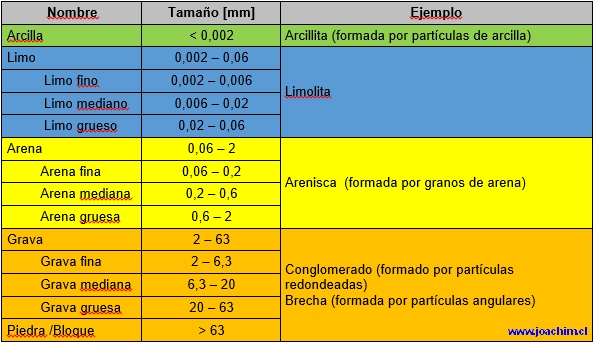 las partículas (= "clastos"), se diferencia las siguientes clases de sedimento: