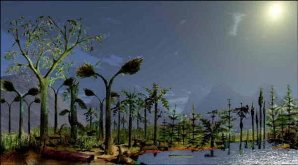 Petrografìa Un tercer grupo de rocas sedimentarias es representado por las llamadas "rocas sedimentarias biológicas". Estas rocas se producen por una transformación paulatina (carbonización) de material orgánico a carbón en un ambiente anaeróbico (sin oxígeno, por ejemplo en un pantano) y bajo presión de capas de sedimentos que sedepositan encima.. La transformación ocurre en fases, del grado de carbonización más bajo hacía el grado más alto: madera - turba - lignita - hulla - antracita Reconstrucción de un paisaje del Carbonífero, Europa Central: