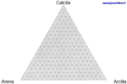 Petrografìa - Rocas sedimentarias compuestas Hay rocas transitorias entre las rocas sedimentarias clásticas y químicas, que contienen calcita, arcilla y arena. Un ejemplo es la "marga", una roca que contiene entre 35 y 65 % calcita, más componentes clásticos (en su mayoría minerales de arcilla, pero también un componente de arena). Estas rocas se puede clasificar mediante un diagrama triangular similar al diagrama QAPF: |